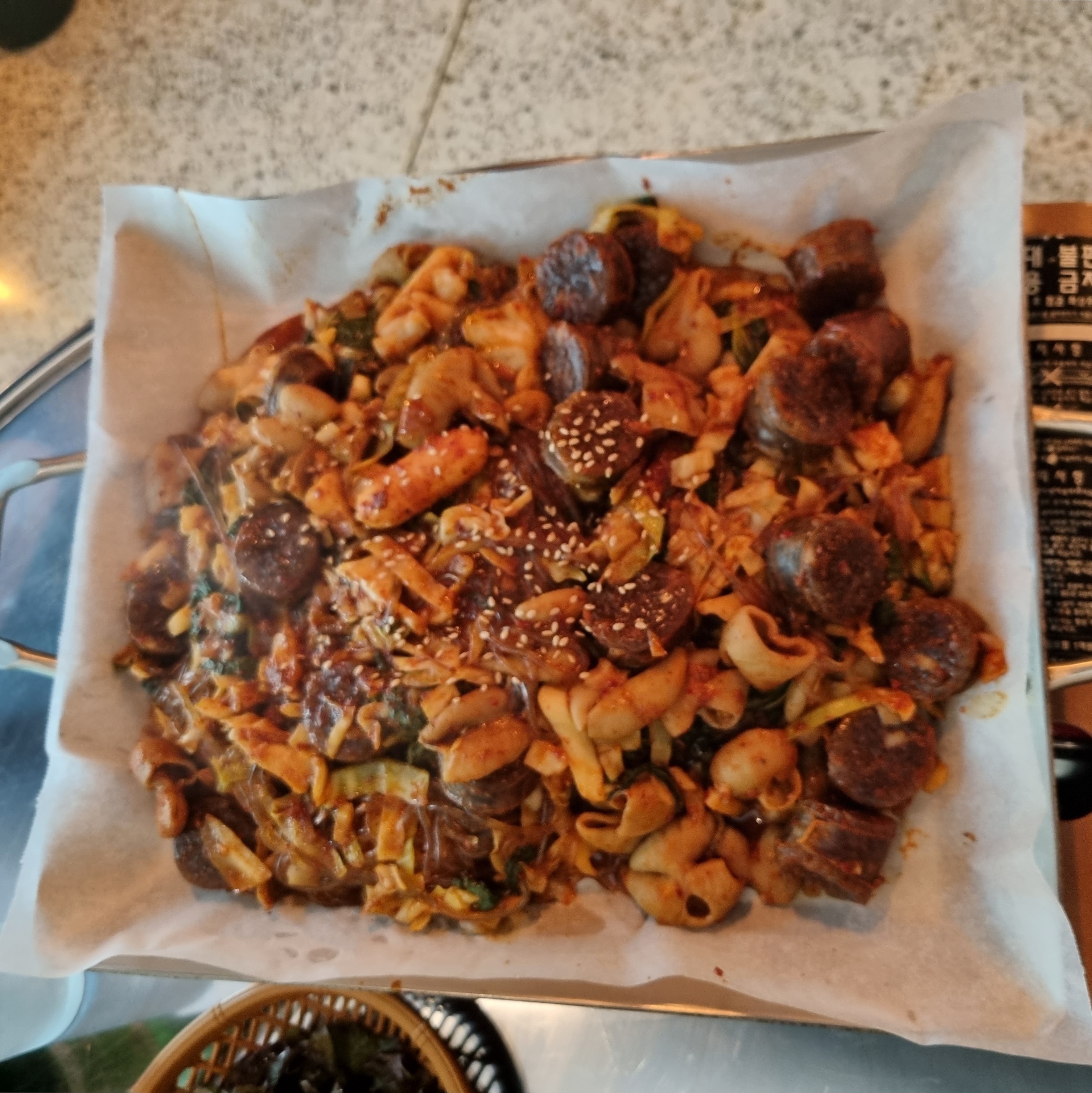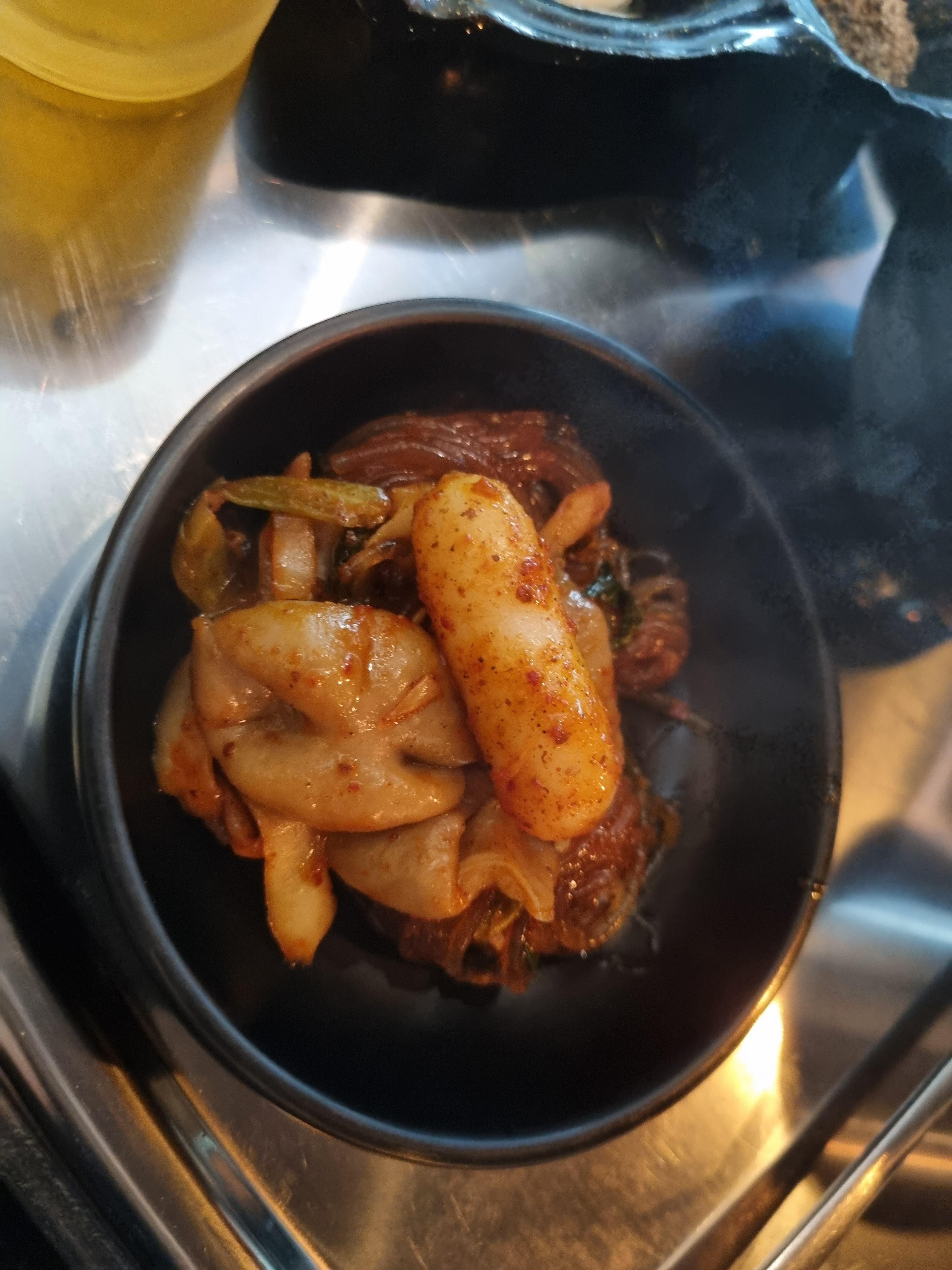 어제 먹었는데도 사진을 보니 꼴깍 침이 넘어갑니다. 순대와 곱창 양은 말할 것도 없고, 양배추와 당면 사리도 푸짐하게 들어가 있어요. 중간중간에 치즈떡과 일반 떡 사리도 보입니다.