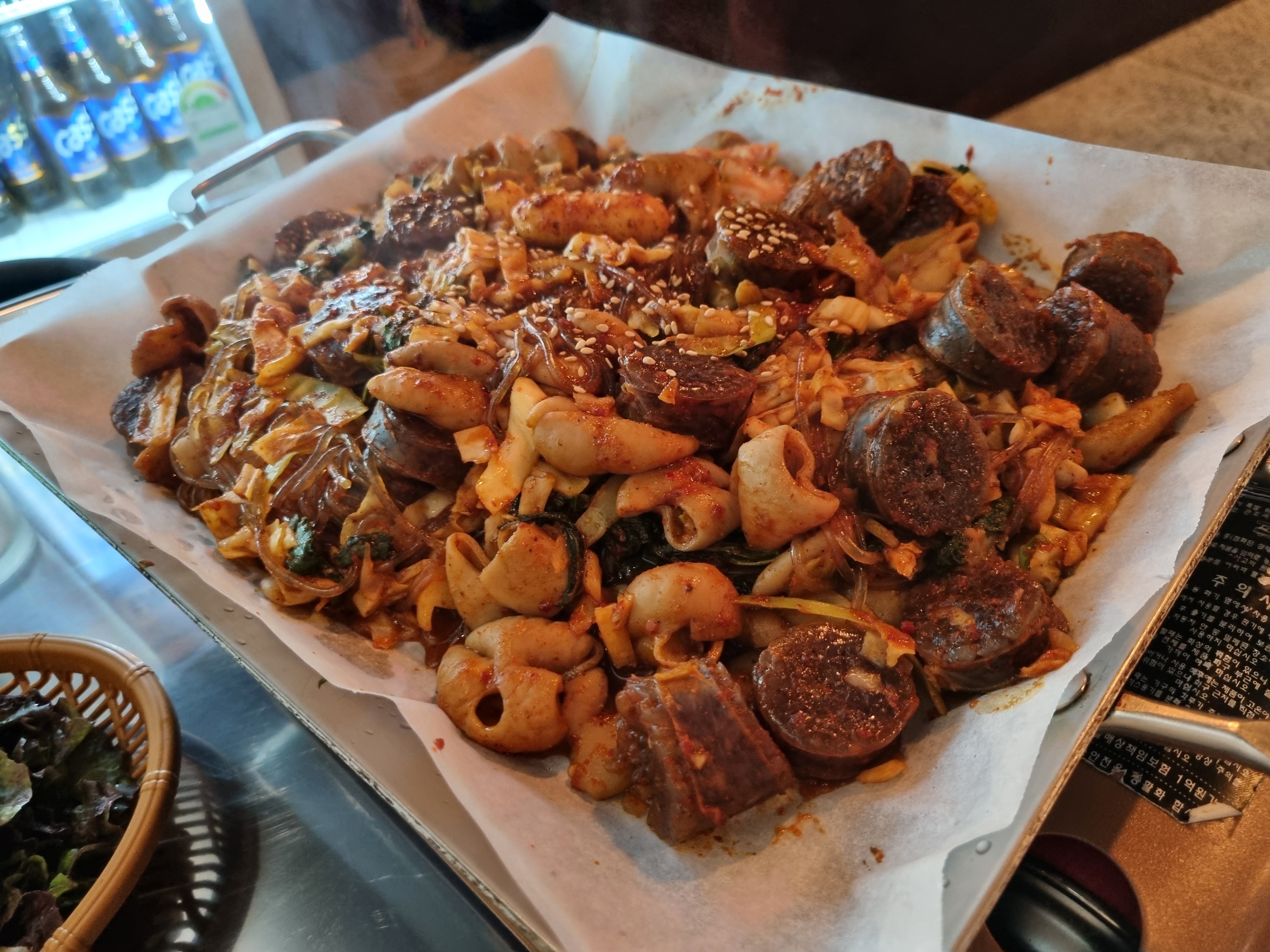 초점이 살짝 어긋났지만 전체적인 양을 보여드리고 싶어서 올리는 사진입니다. 분명 2인분을 시켰는데 3인분 같은 2인분이 나왔어요. 심지어 순대볶음 1인분에 순대곱창 1인분을 섞어 시킨 걸 감안하면 곱창 양이 어마어마하게 많네요.