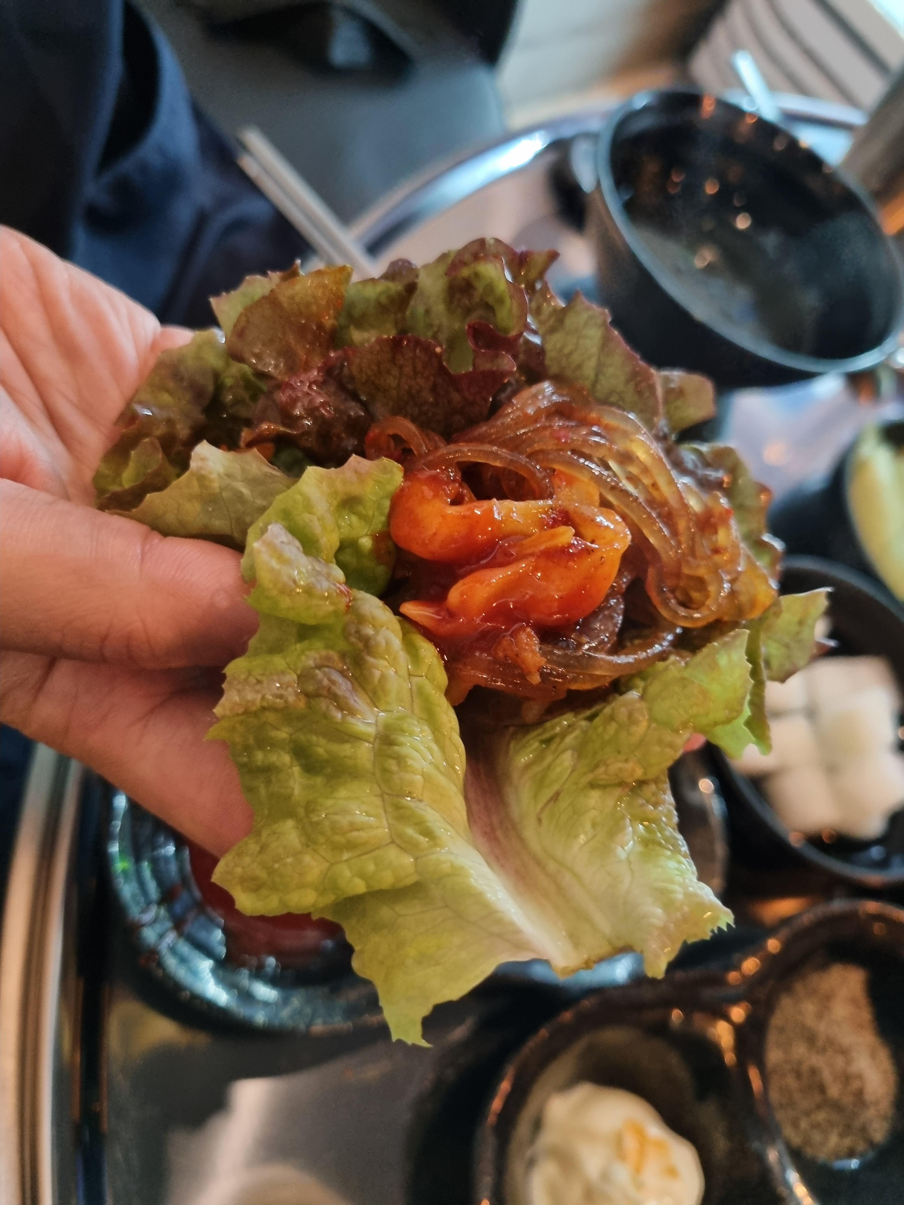 앞접시에 당면과 떡 사리, 깻잎, 양배추, 곱창까지 한 가득 담아서 먹었어요. 젓가락으로 집어 먹다가 심심하다 싶으면 채소에 싸먹고, 소스에 찍어먹고 이날은 거의 대화도 없이 흡입했어요.