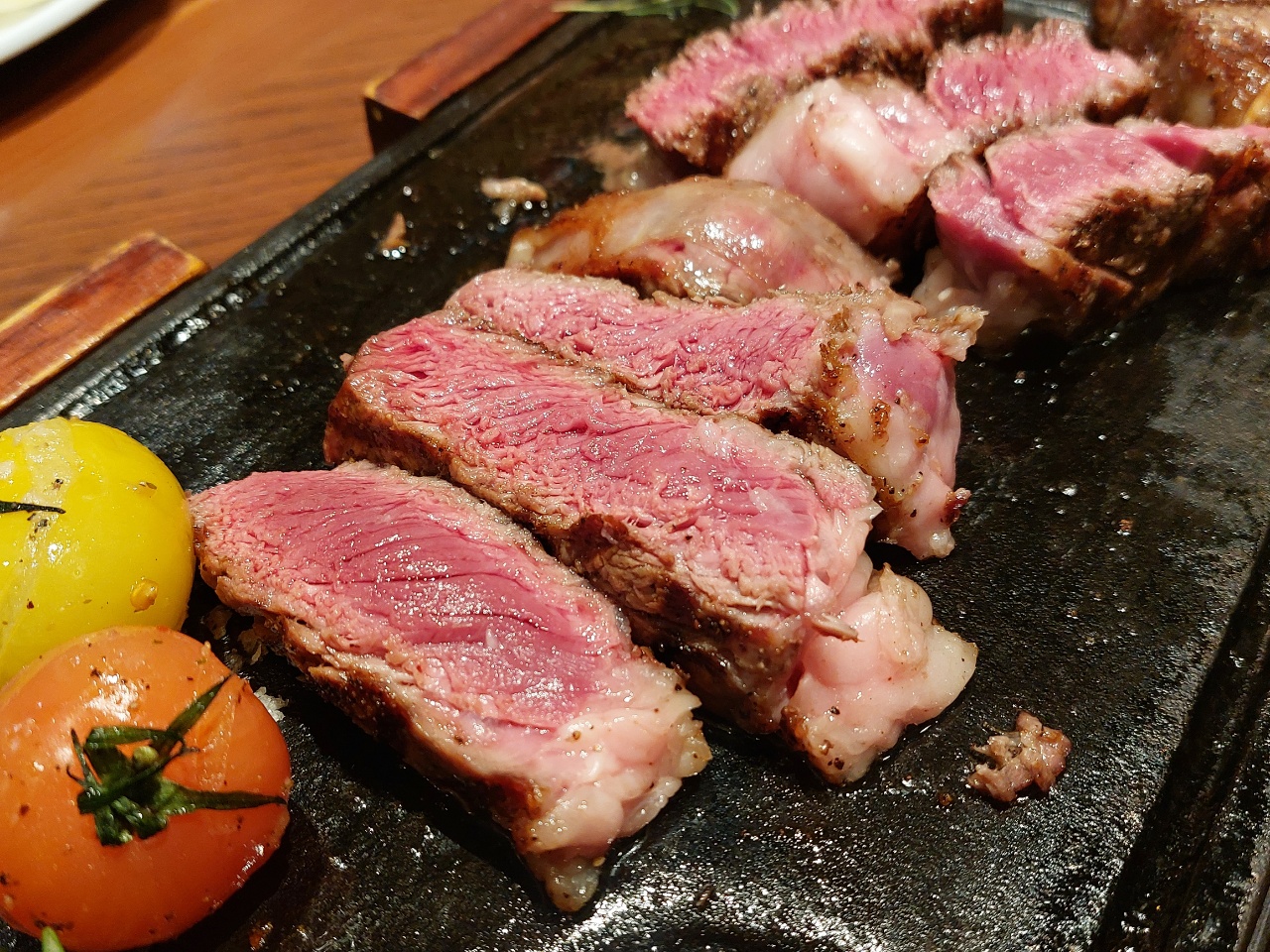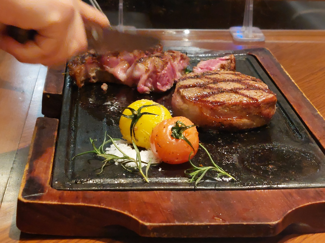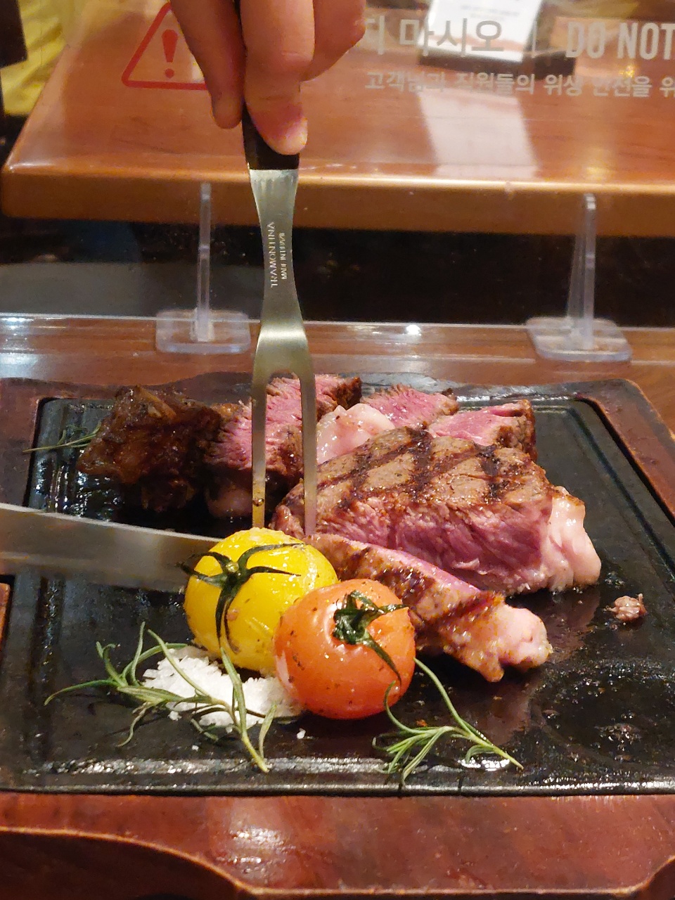 굽기는 미디엄 레어로 했어요. 미디엄이나 웰던을 좋아하시는 분들도 본인이 좋아하는 굽기보다 조금 덜 익히는 걸 추천해요. 철판 위에 올라가 있어서 자칫하면 질겨질 수 있다고 직원 분이 팁을 주셨어요.
