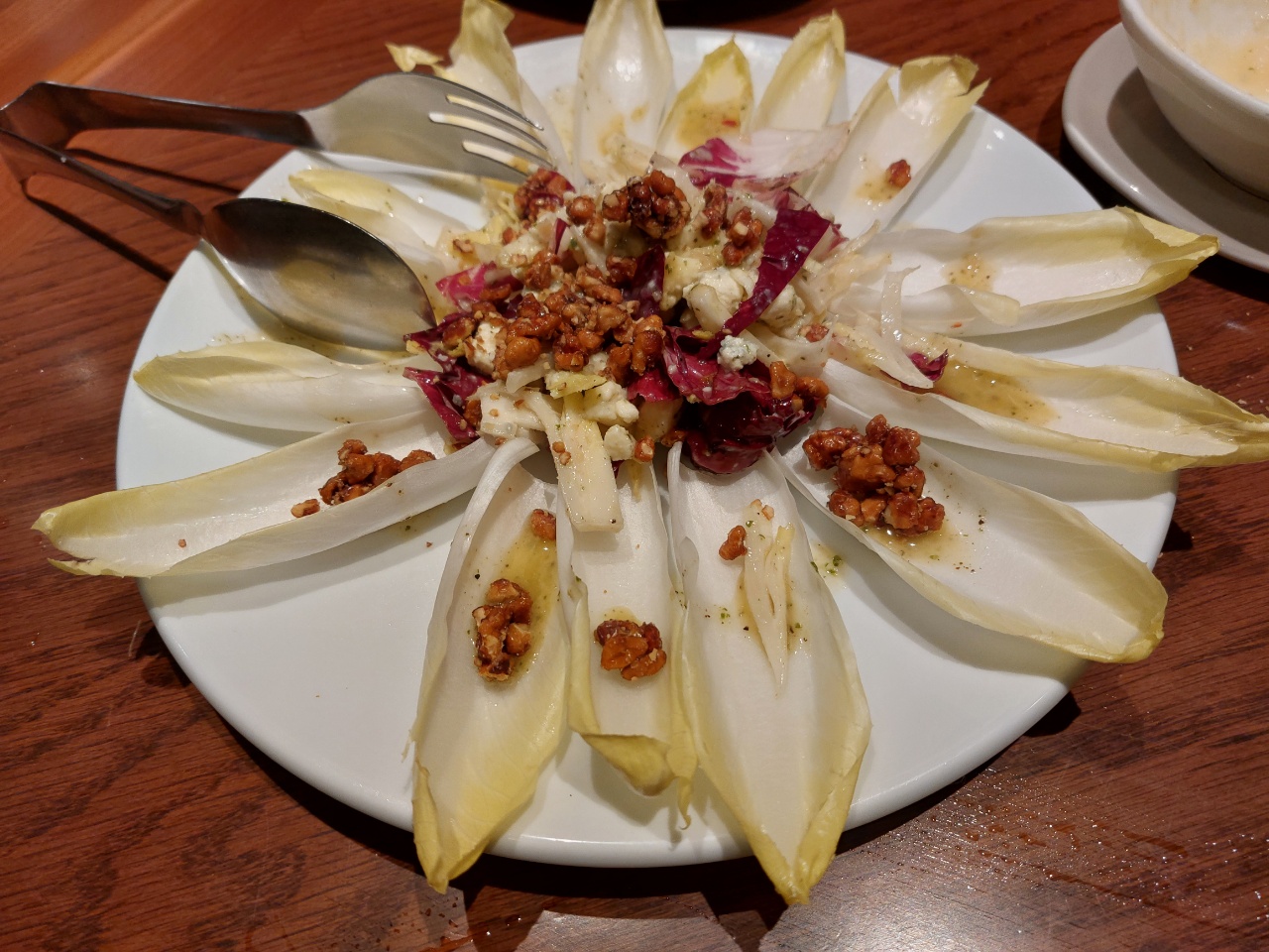 엔다이브와 라디치오에 호두강정과 블루치즈를 얹은 샐러드로 설명되어 있는데 맛이 매우 써요. 꽃상추도 라디치오도 둘 다 쓴 맛이 나는 채소인데 가족들이랑 셀카 찍느라 정신 팔려서 바꿀 수 있는지 물어보는 걸 까먹었어요.