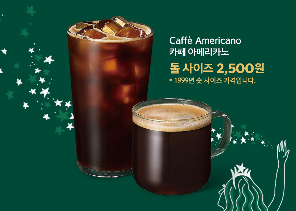 할인 적용 메뉴가 아쉽게 아메리카노 하나 뿐이지만, 요즘 같은 고물가 시대에 톨 사이즈가 2,500원이라니 매우 저렴하다고 할 수 있겠네요. 테이크아웃 커피 가격도 점점 올라가고 있는 마당에 많은 사람들이 스타벅스를 방문할 것이 예상됩니다. 참고로, 해당 가격은 1999년도 당시 스타벅스 아메리카노 숏 사이즈의 가격이었다고 하네요.