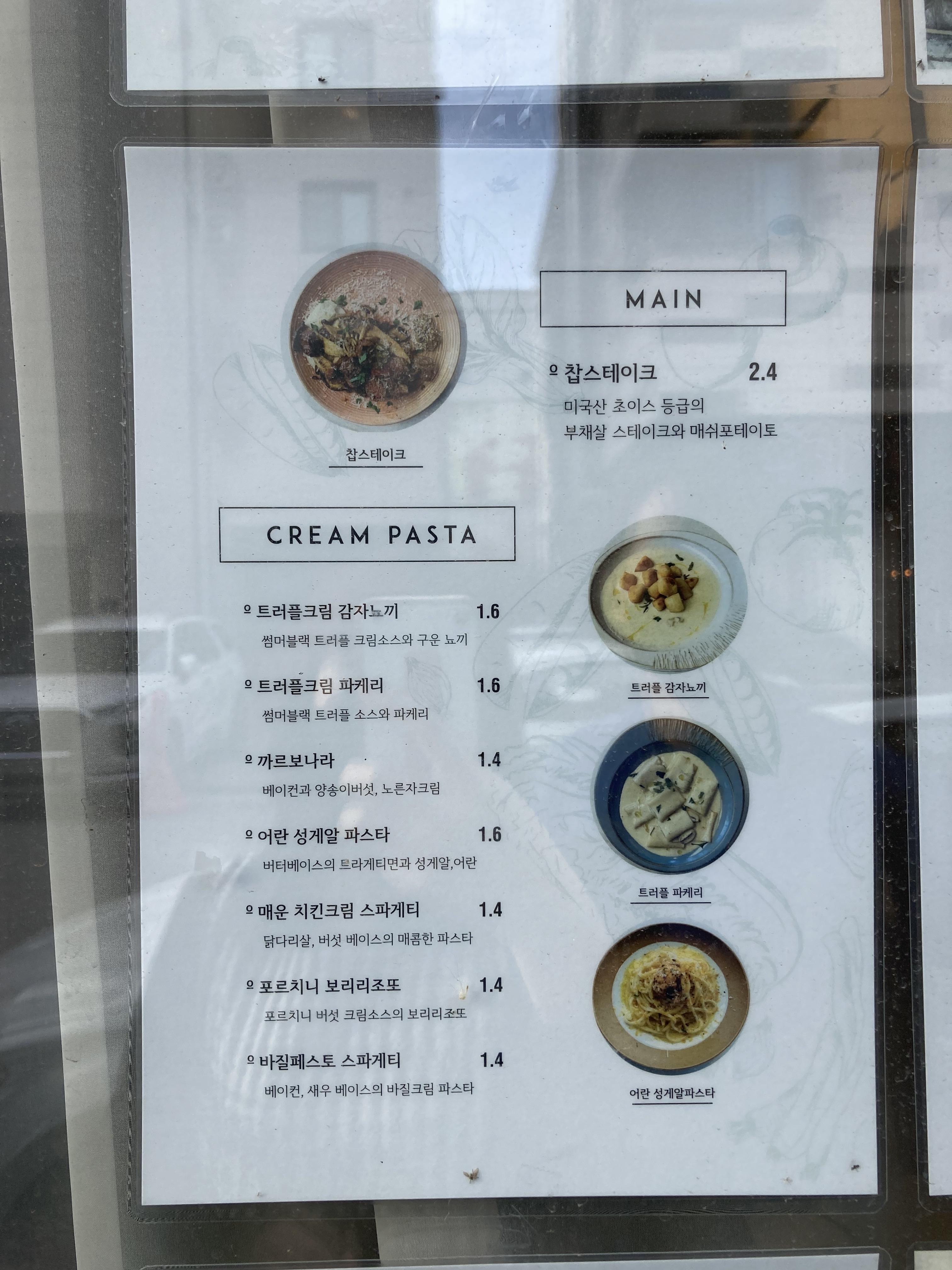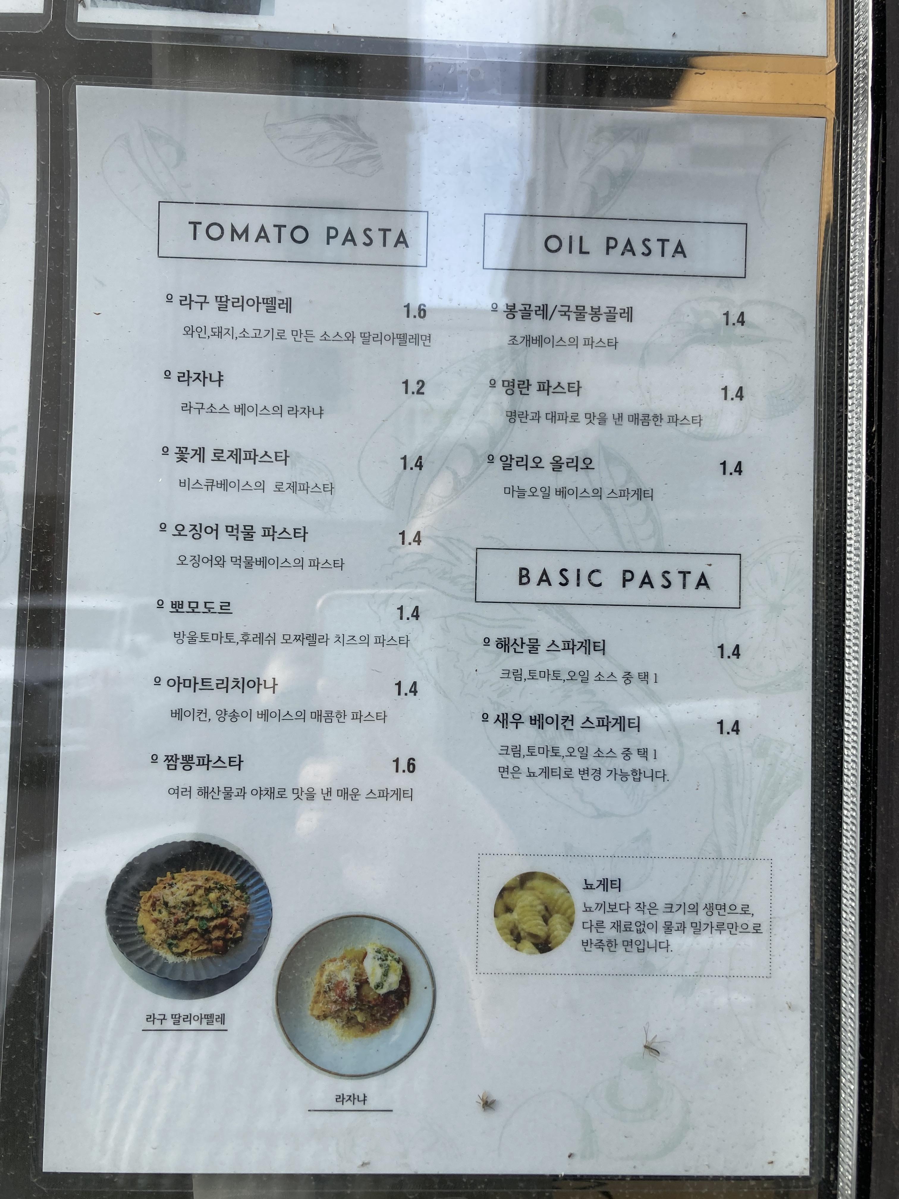메뉴가 생각보다 꽤 다양해요. 오늘 선택한 메뉴는 꽃게로제파스타와 알리오올리오였습니다.
