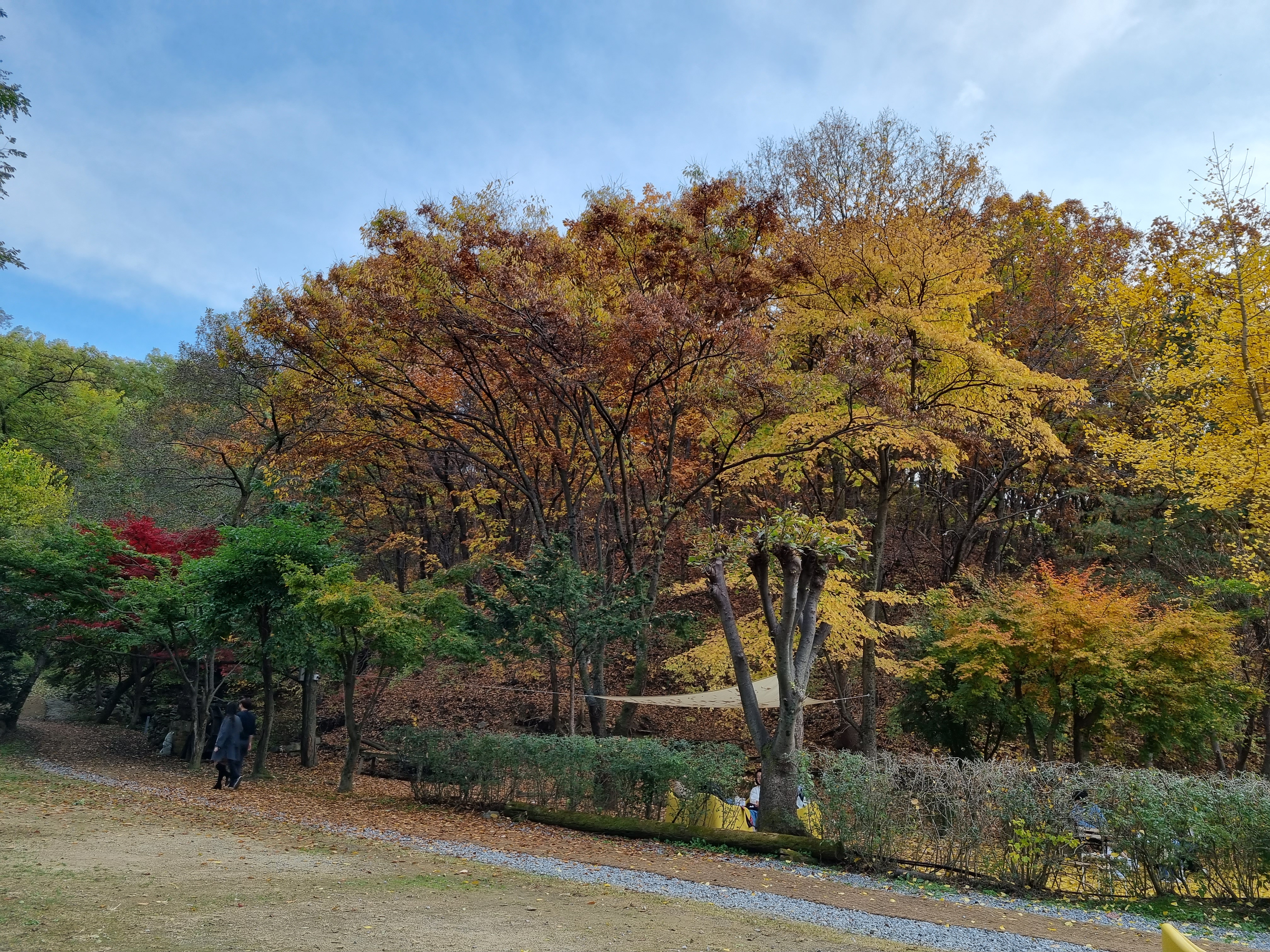 따뜻한 햇살에 예쁜 단풍숲 뷰 보면서 힐링하기! 돈 버느라 힘들었던 노동자의 피로가 다 날아가는 기분입니다.