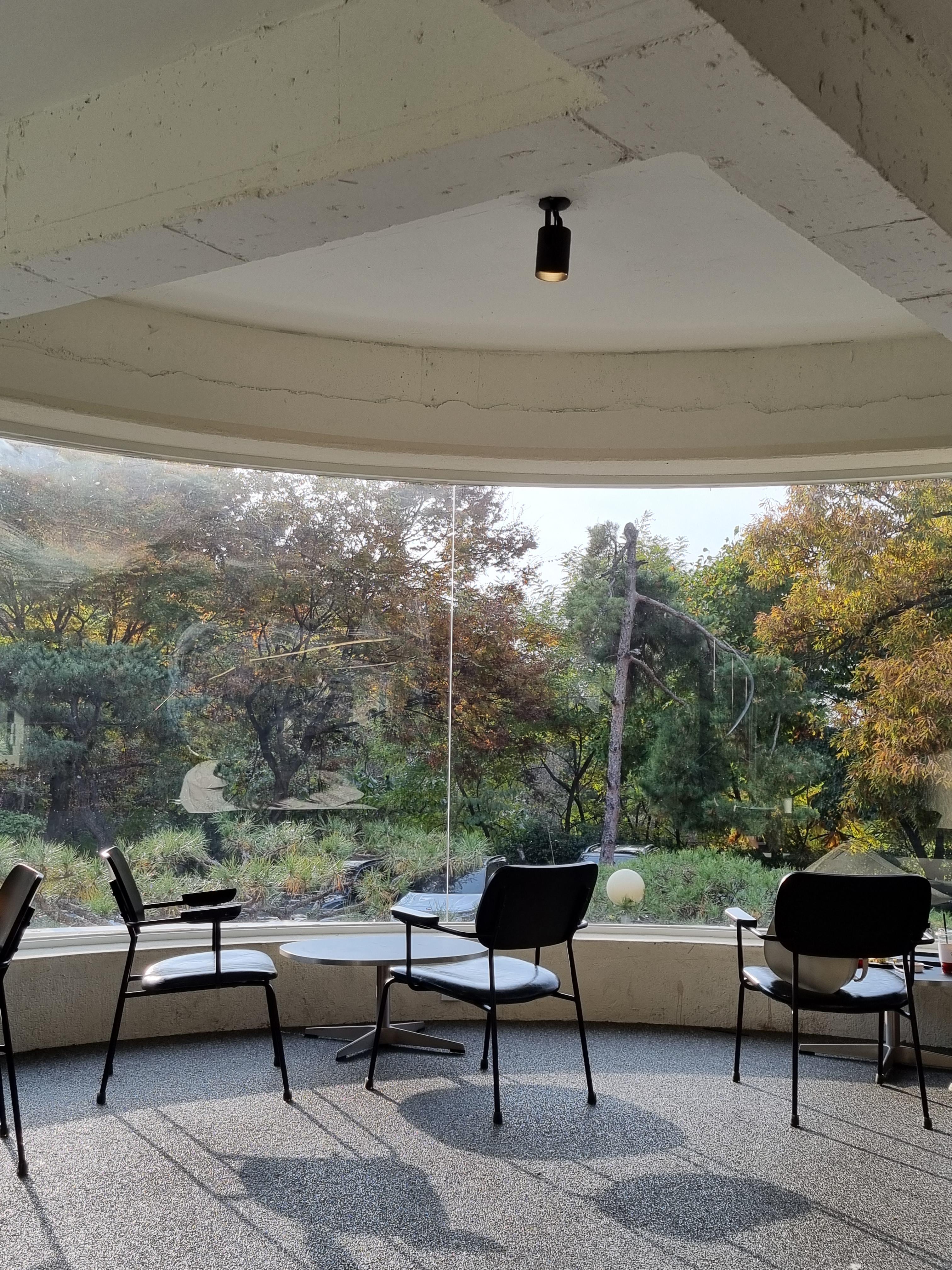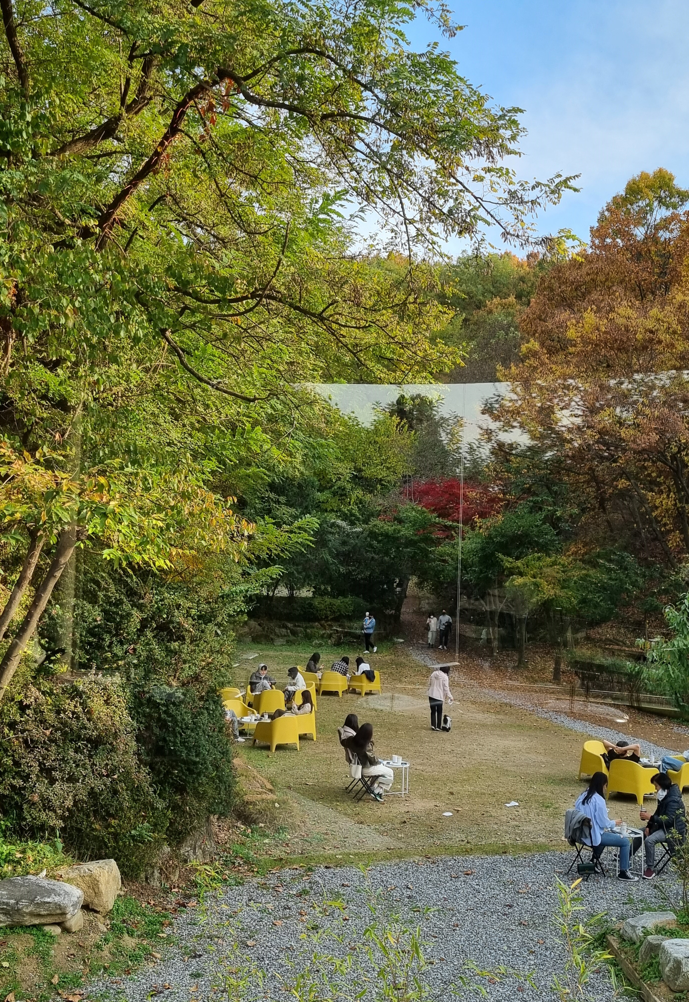 저는 2층 창가에서 햇살 쬐며 단풍숲을 구경하다가, 야외에 자리가 났길래 얼른 이동했어요.